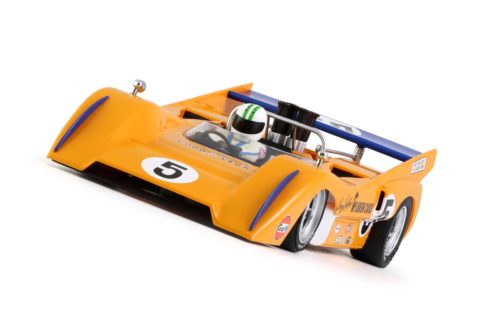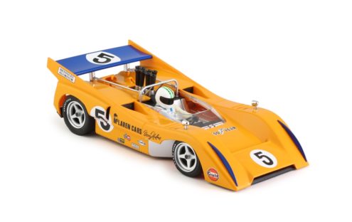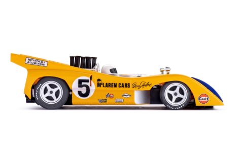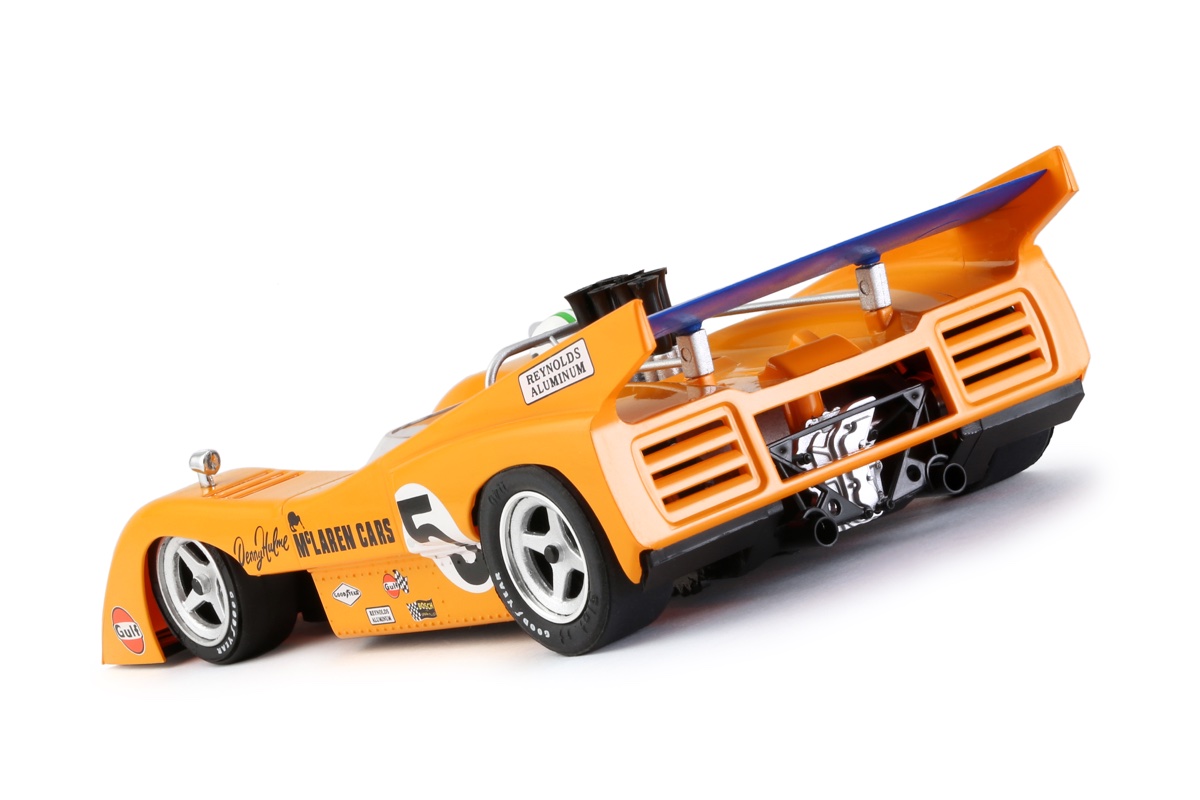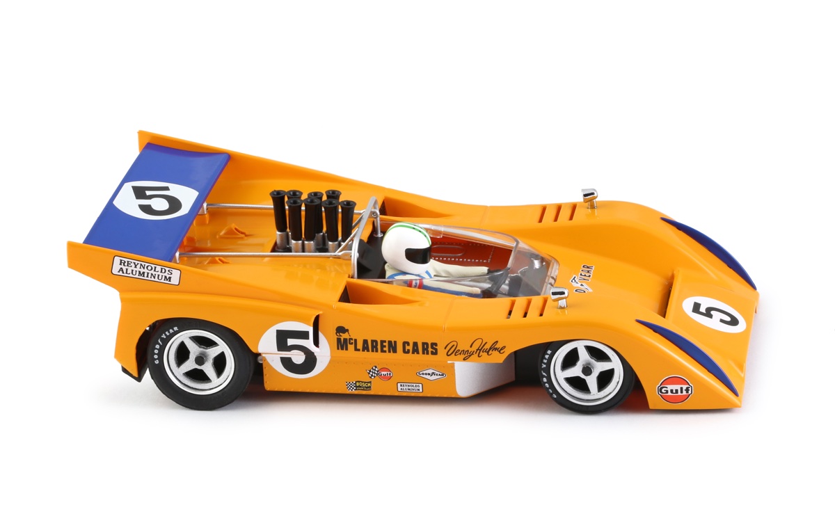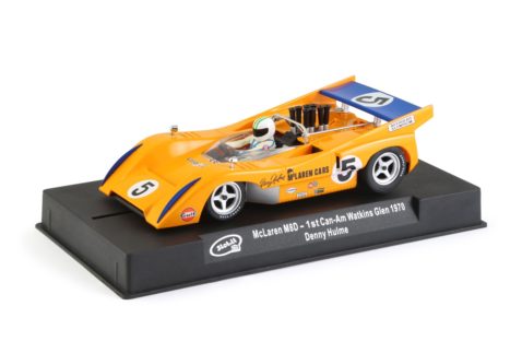 The M8D was a prototype race car, built in 1970 by McLaren Cars to compete in che Can-Am Challenge Cup. In comparison with the former ‘M8’, the M8D was wider and with a lower wing, which was also braced to the chassis, as the high mounted, suspension attached wings had been banned. Chassis was an aluminium sheet monocoque with steel bulkheads and stressed engine. Bodywork was in glass-fibre. The engine was a Chevrolet with Lucas fuel injection, prepared by George Bolthoff; it was a 7.6 litres V8 yielding 680 Hp of maximum power. The transmission was the 4 speeds Hewland LG500. The wheels had a 15 inches diameter, a width of 11 inches at front and 16 inches at rear. Tracks: front 1575 mm, rear 1486 mm. Wheelbase: 2387 mm. Width: 1930 mm. Length: 4166 mm.The overall weight was 634 kg. For the Australian Denny Hulme, Watkins Glen was the first of the many victories (more than half of the races) which led him to win the overall Can-Am 1970 championship.